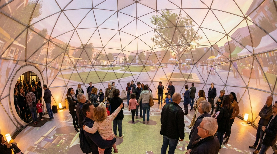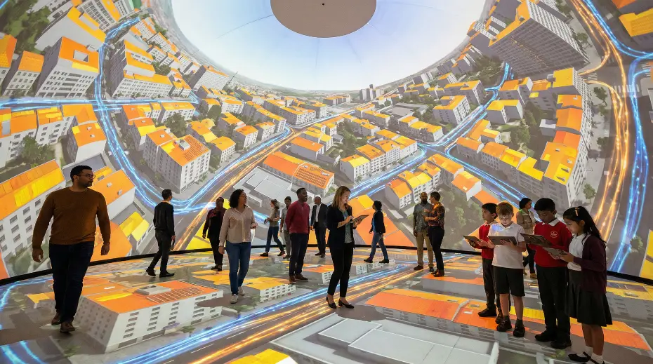 - Bürgerbeteiligung: Stadtplanung wird z.B. über Urbane Digitale Zwillinge erlebbar. Wir stehen unter der Kuppel und zugleich mitten auf dem Platz, der neu bebaut werden soll. Menschen gestalten aktiv mit, statt nur Kreuzchen auf Formularen zu setzen.